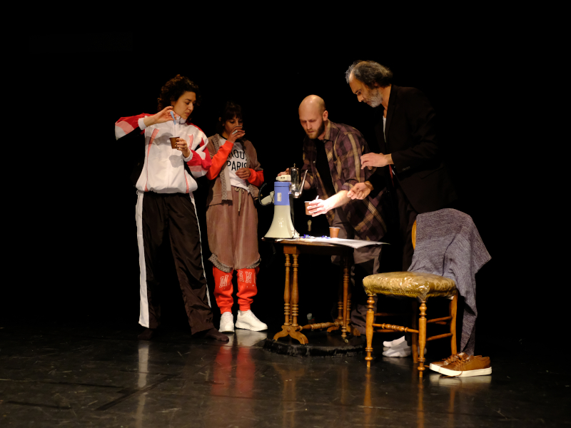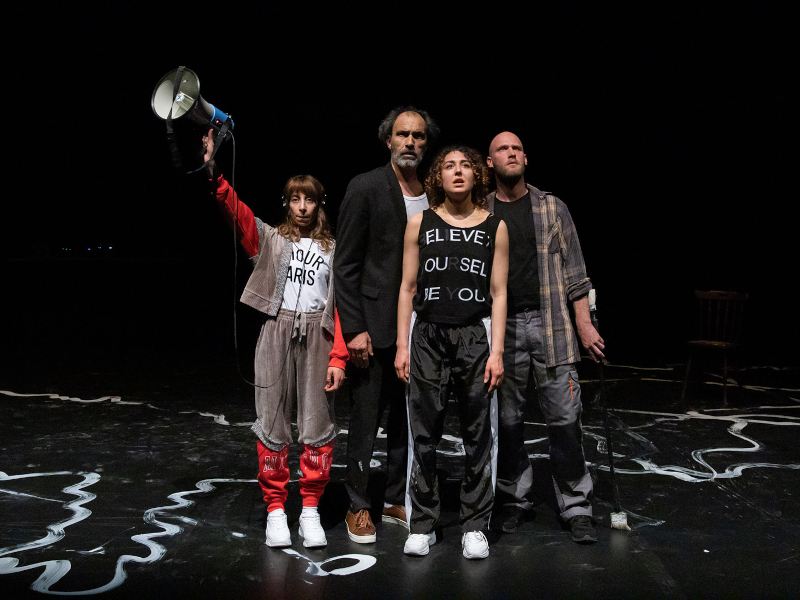 Vier Performer*innen – ein Schauspieler, eine Tänzerin, eine Musikerin und ein Maler – begeben sich immer wieder in Aufbruchsstimmung und kommen doch nie vom Fleck. Sie stehen im Regen, kämpfen gegen Widerstände und wagen Sprünge über Grenzen hinweg – sprachliche, disziplinäre und generationelle. Beim gemeinsamen Teetrinken kommt es zu süssen Wortgefechten, bittere kulturelle Klischees stecken fest im Hals und müssen rausgebrüllt werden. Und doch schnallen sie sich am Ende die Sneakers an und machen sich auf in eine unbekannte Zukunft.